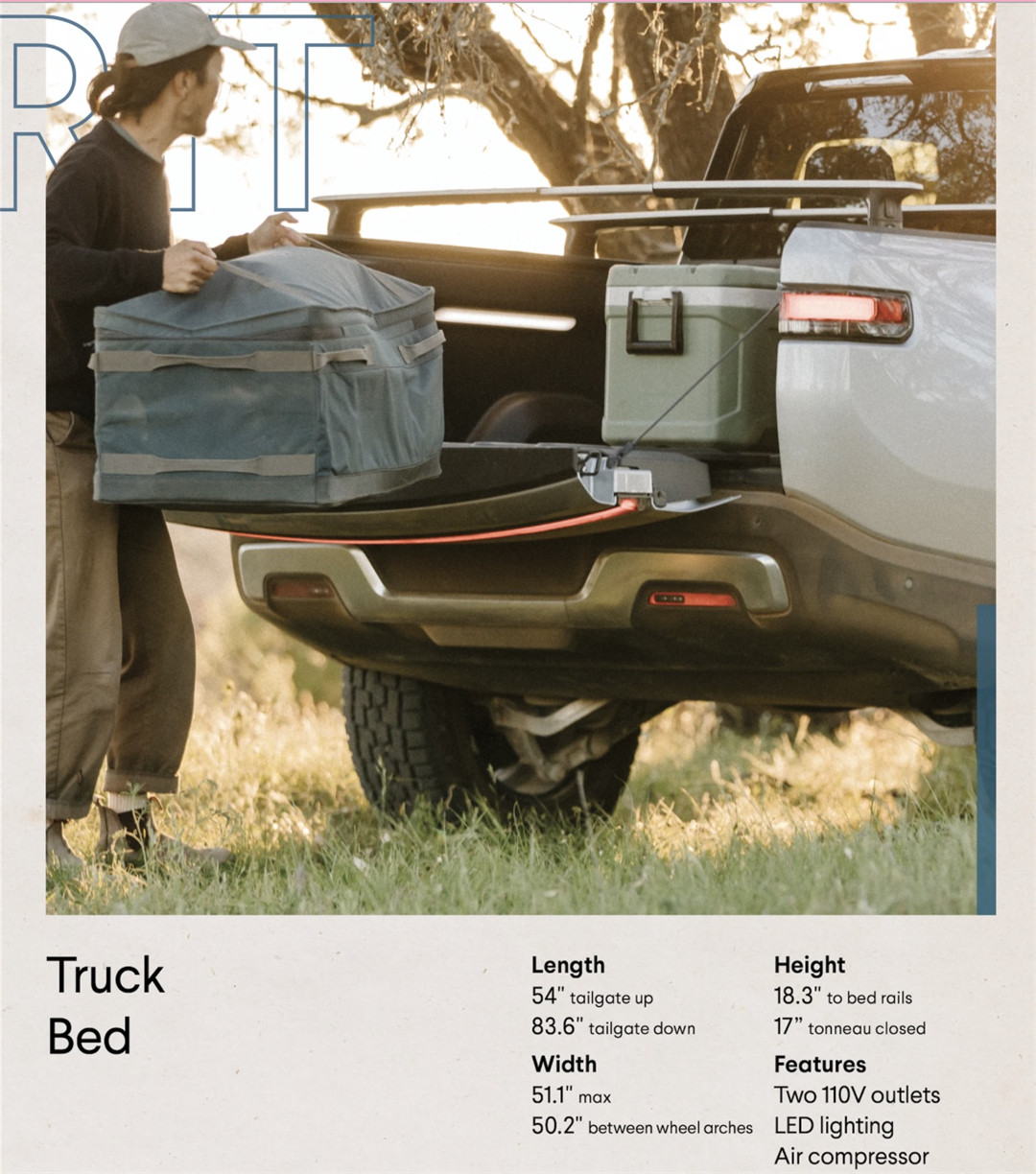 除了它采用的是纯电驱动较为亮眼以外,在其它方面它依旧是一台业务能力强悍的皮卡车型。Rivian R1T作为一款纯电动皮卡车型,它的车身尺寸为5475*2015*1815mm,相较于特斯拉的Cybertruck概念车(5885*2027*1905mm)稍微小了那么一丢,但这并不妨碍于它拥有出色的装载能力。