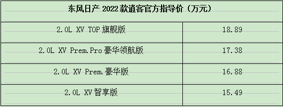 2021年9月24日,东风日产2022款逍客正式上市,共推出4款车型,市场指导价为15.49万元—18.89万元。