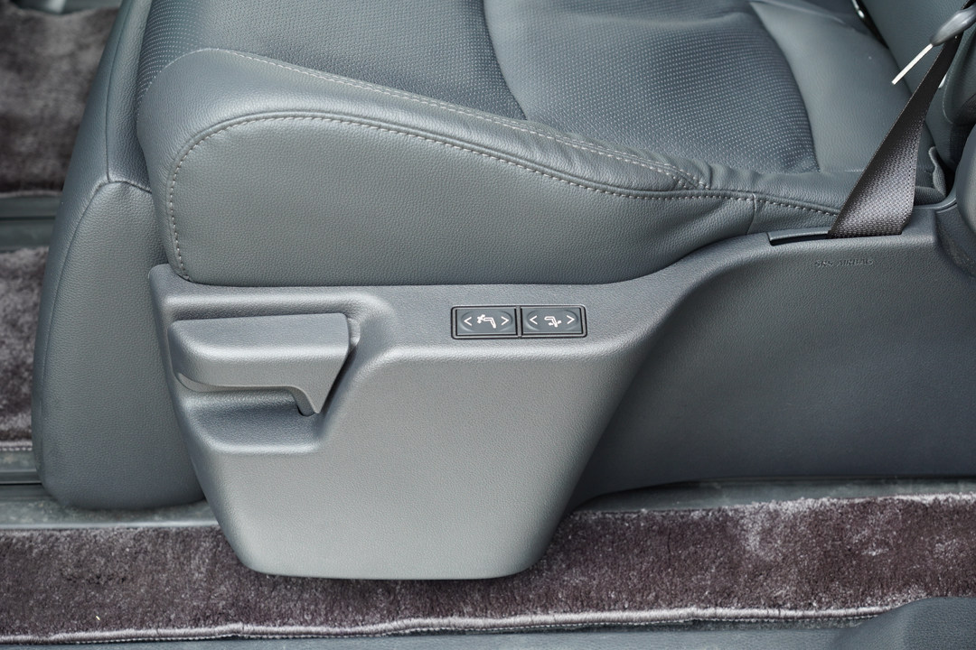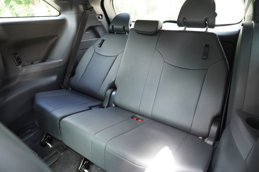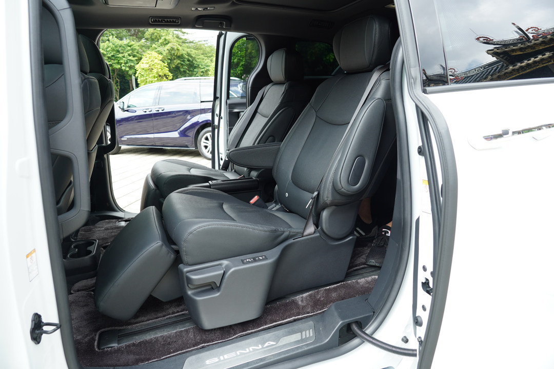 上车以后,座椅带有双扶手设计,并且是规规矩矩的独立座椅,安全带设置在座椅上,腿托、靠背使用电动调节,座椅前后手动调节。赛那拥有同级最长的816mm中排座椅调节长度,并且中排座椅靠背调节角度达到81°这一点值得称赞。