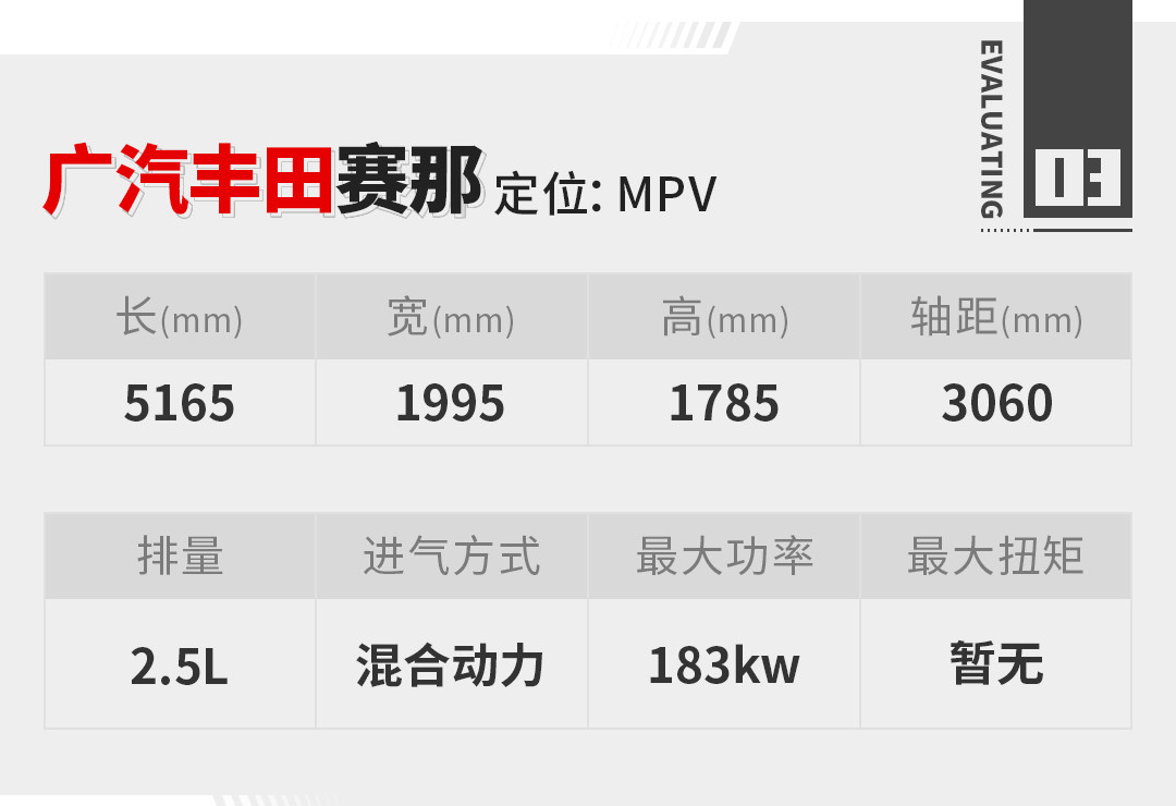 全新赛那全系标配混动系统,由2.5L发动机和电机组成,系统最大功率183kW,电池拥有八年或20万公里的质保,再加上丰田混动系统已经使用多年,无需担心其可靠性。