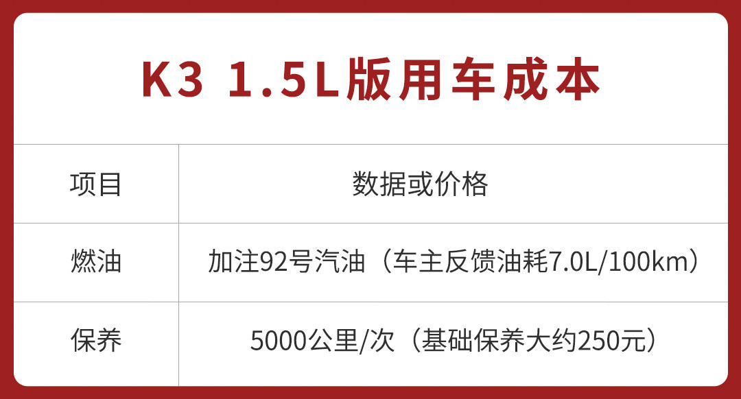 以最多人选择的1.5L自吸版本为例,起亚K3充分展现了省心、亲民等优点,油耗方面大部分车主反馈为7L/100km,按照目前92号汽油价格计算相当于每公里不到5毛球,不仅如此,其小保养价格约为250元左右,几乎是目前该级别最亲民的车型之一。