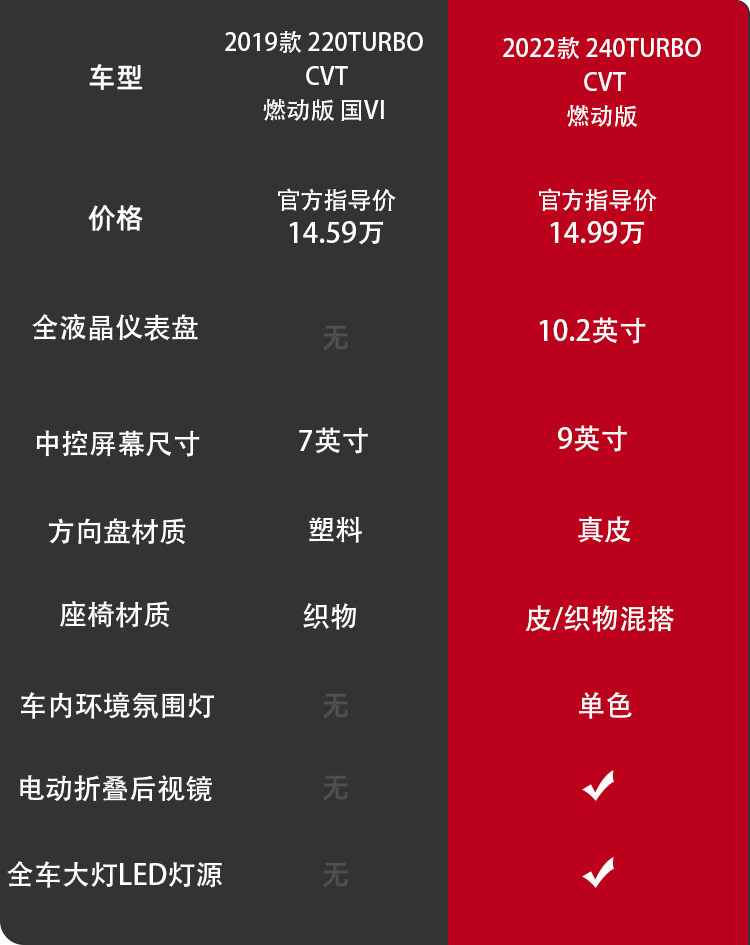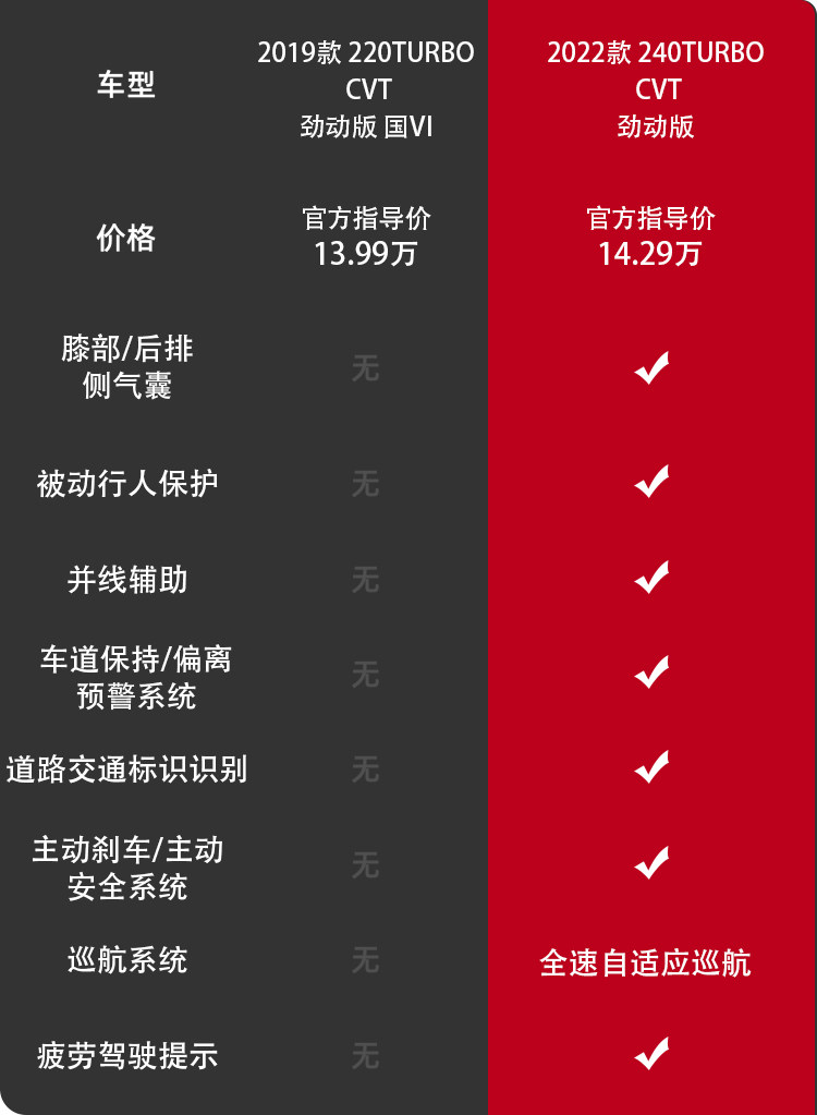 2019款 220TURBO CVT劲动版 国VI(13.99万)和2022款 240TURBO CVT劲动版(14.29万)两者均为相同版本,除了发动机功率有所差异以外,具体差异在主动安全配置上,并且新款在该版本开始就标配了全速自适应巡航。