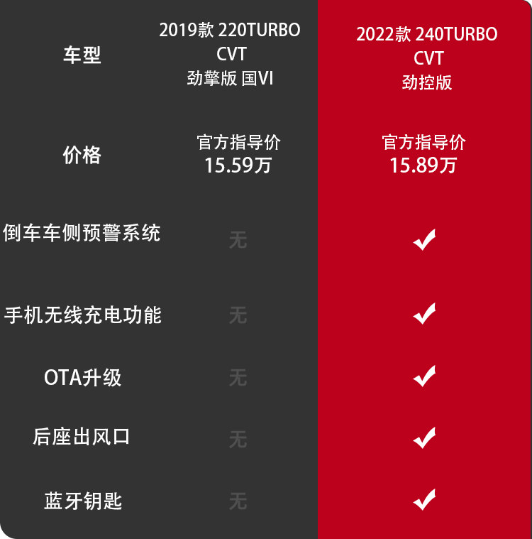 2019款 220TURBO CVT劲擎版 国VI(15.59万)和2022款 240TURBO CVT劲控版(15.89万),虽然两者为不同版本,但是在售价上相差并不是很大,具体相差的配置更多是日常便利性功能的提升。