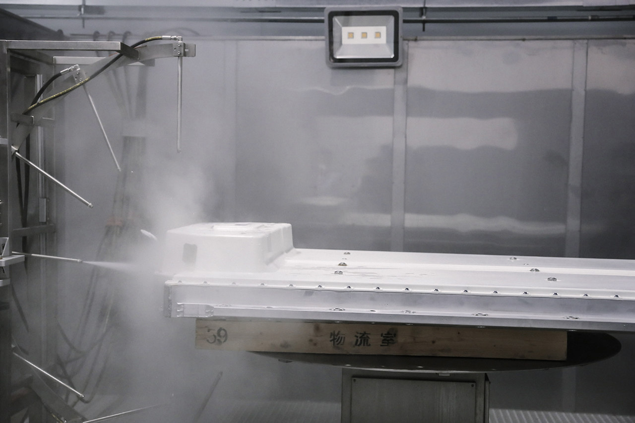 最后一项则是高温、高压喷水测试,主要是用来测试动力电池各处接口的密封性,通常情况下,电池组外部还有车体保护,所以现实中几乎不存在高压水流直接冲击电池组及其接口的情况,不过岚图还是进行了尝试。实验台上有多个高压喷头,从不同角度对电池接口喷射,水温在75-85摄氏度之间,喷射压力为10Mpa。以这样的强度冲击了3分钟,电池组没有异常发生,也没有进水,密封性相当出色。