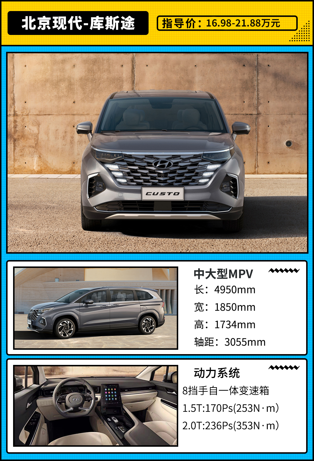 近日,北京现代带来了让大家期待已久的MPV车型——库斯途,新车将推出5款车型,全系搭载1.5T/2.0T涡轮增压发动机+8AT变速箱,售价区间为16.98-21.88万元。