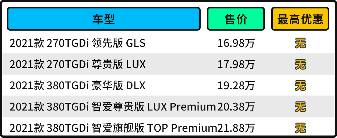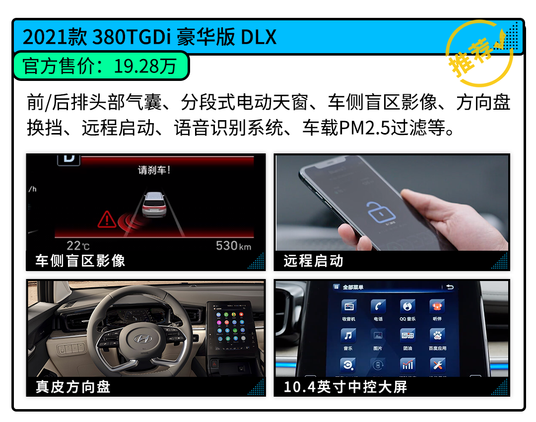 库斯途2021款 380TGDi 豪华版 DLX比库斯途2021款 270TGDi 领先版 GLS贵了2.3万元,但配置却增加了不少,包括前/后排头部气囊、分段式电动天窗、车侧盲区影像、方向盘换挡、远程启动、语音识别系统、车载PM2.5过滤等功能。总的来说,这2.3万元花在了实在的地方,所以买买君非常推荐。