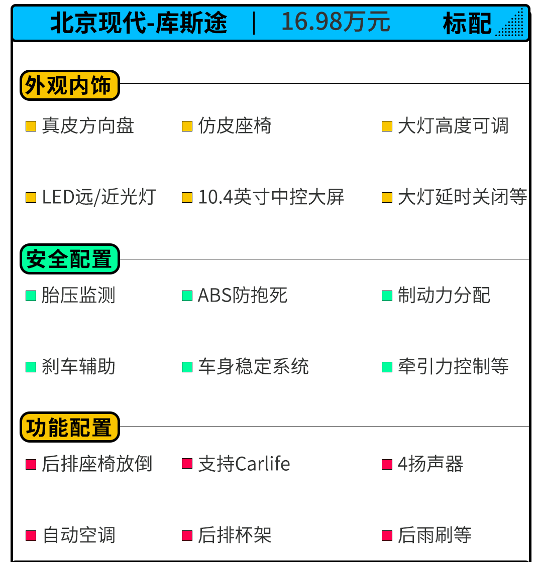 库斯途2021款 270TGDi 领先版 GLS作为入门版车型,其售价低至16.98万元,但是把胎压监测、倒车影像、10.4英寸中控大屏、自动空调、真皮方向盘、仿皮座椅、车载空气净化器等配置,虽然是最低配车型,但对于老司机而言这些配置绝对够用,对于购车预算并不是十分充足的消费者,确实是个不错的选择。