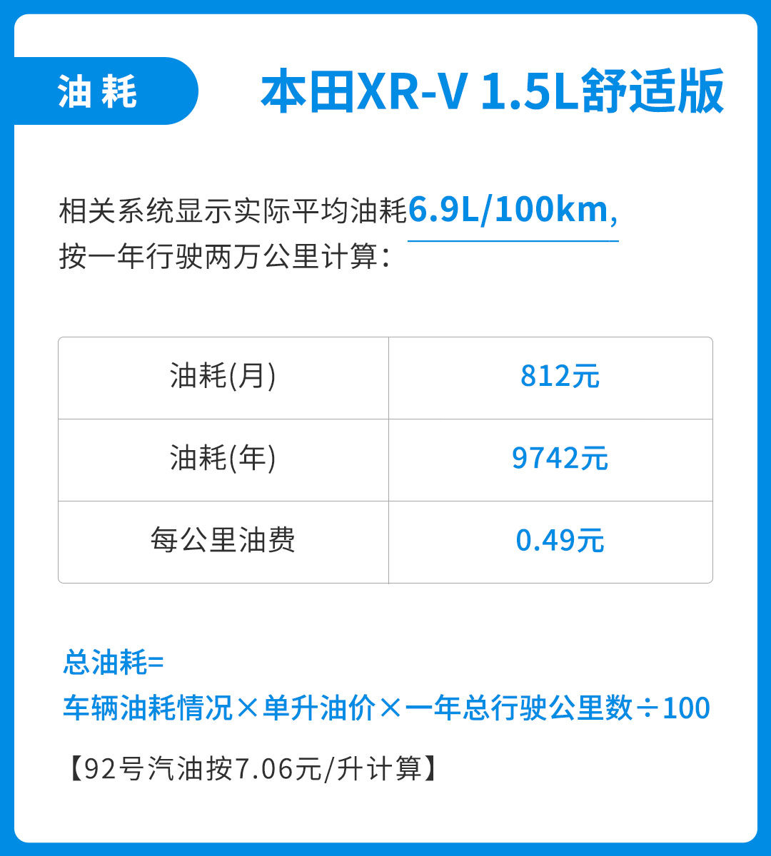 油耗方面,我们从相关渠道了解到,本田XR-V 1.5L舒适版车主的实际平均油耗为6.9L/100km。根据目前广东地区92号汽油7.06元/升的单价计算,1年行驶2万公里的油费为9,742元,没月平均约812元,每公里平均约0.49元。