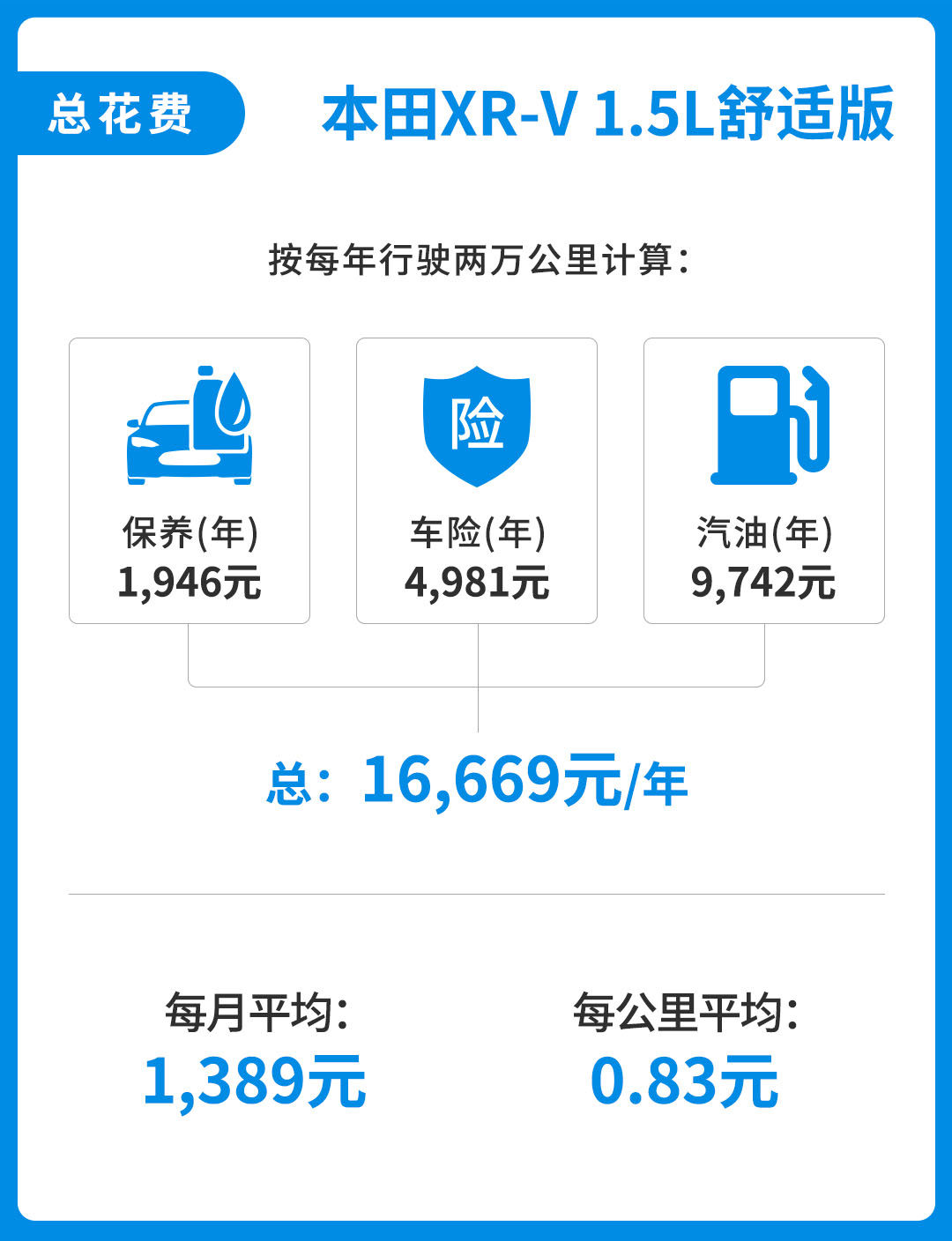 综合来看,本田XR-V 1.5L舒适版每年的固定养车成本为1,946(保养)+4,981(保险)+9,742(油费)=16,669元。每月平均约1,389元,每公里约0.83元。