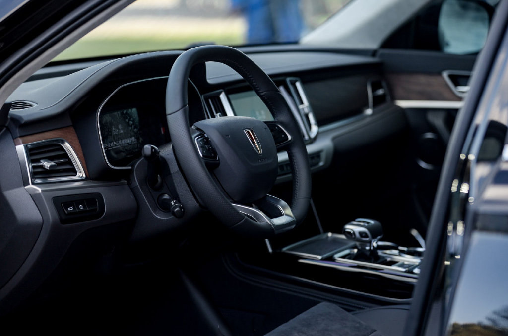 进入车内,红旗HS7的内饰设计依旧是成熟稳重的风格,没有双连屏的时尚设计,也没有夸张的撞色搭配,只有充满质感的木纹饰板和菱格的皮质,豪华感提升不少。