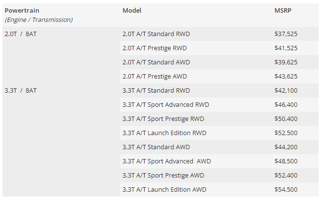 动力方面,海外版G70根据车型的不同(普通版/运动版)分别搭载2.0T和3.3T发动机。其中普通版搭载2.0T发动机,最大功率为245马力,与之匹配8AT变速箱;运动版车型搭载3.3升V6双涡轮增压发动机,最大功率365马力,提供6MT和8AT变速箱可选。