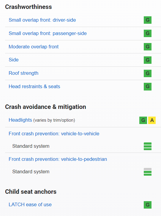 而在其余的车顶强度测试、头枕测试、预防正面碰撞测试(车辆、行人)以及灯光测试当中也均获得G的优异成绩,可以说基本上是以“全优”的姿态通过了严苛的IIHS碰撞测试。