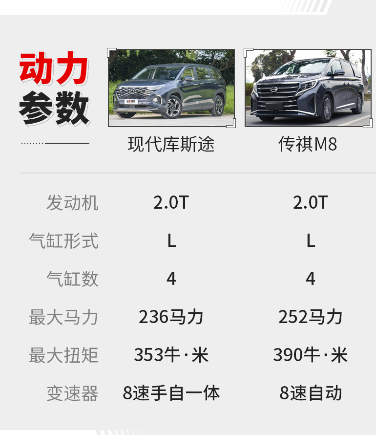 现代库斯途已经正式上市,16.98-21.88万元的指导价,对于自主品牌中大型MPV来说杀伤力可不少,那么自主品牌当中卖得最好的传祺M8是否能顶住压力呢?也许你会从下面的对比当中找到答案。(因为是同价位对比,此次传祺M8参考23.98万元的配置。)
