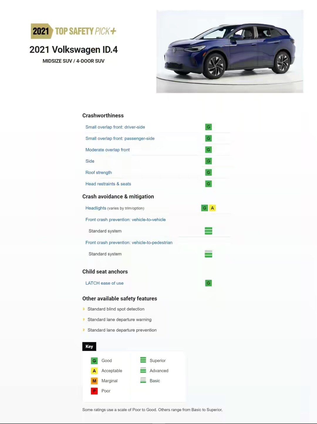 并且车辆还必须配备前部碰撞预防系统,且在评估中均获得Advanced(高级)或Superior(卓越)的评价。另外,接受测试的车辆灯光也要经过测试,必须获得良好或及格才可获得此殊荣,可见大众ID.4的安全性是经得起碰撞。