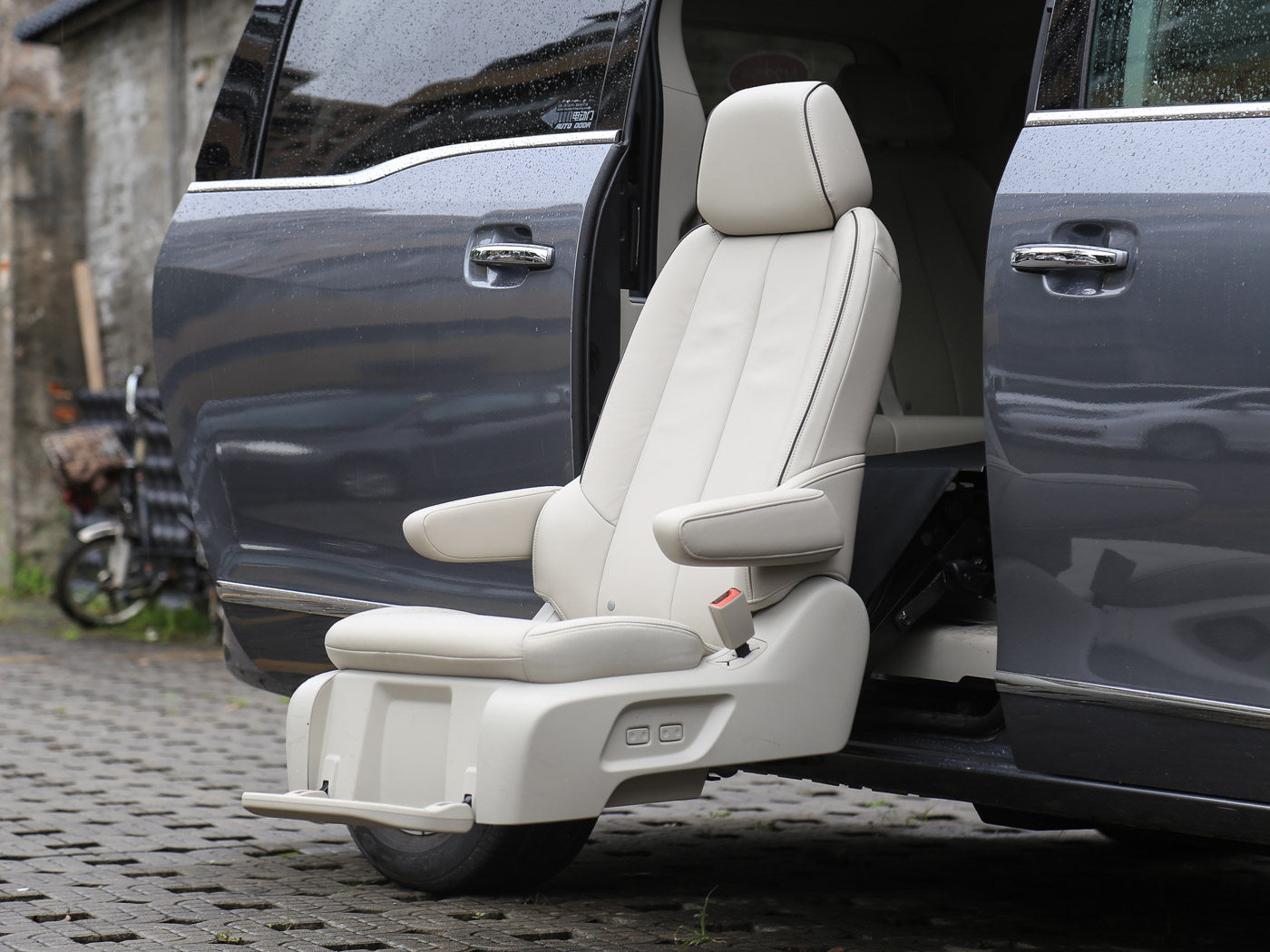 而赛那福祉车可通过电动调节将第二排座椅向外旋转,并在伸出车外的同时下将至为最低的高度,让一些行动不方便的老人或伤残人士能够轻松乘坐在座椅上,并将恢复至车内。很大程度上帮助了一些行动不便人士上下车辆。