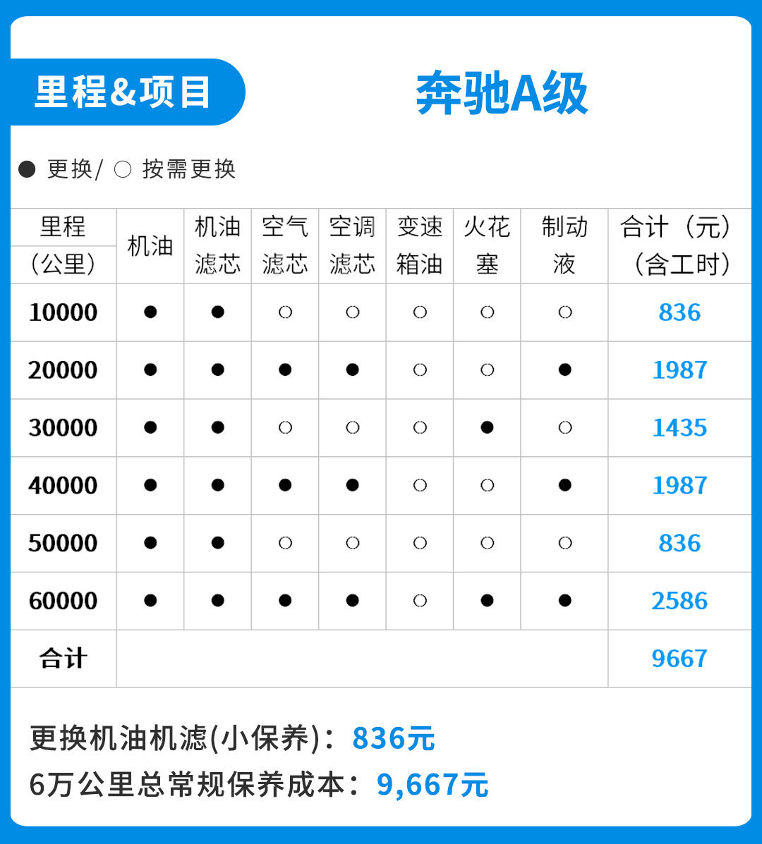 根据厂家建议,奔驰A级的保养周期为1万公里,按1年行驶2万公里计算,3年6万公里的总保养费用为9,667元,每年平均约3,222元,每月平均约269元,这个费用是同级普通合资品牌车型的两倍左右。