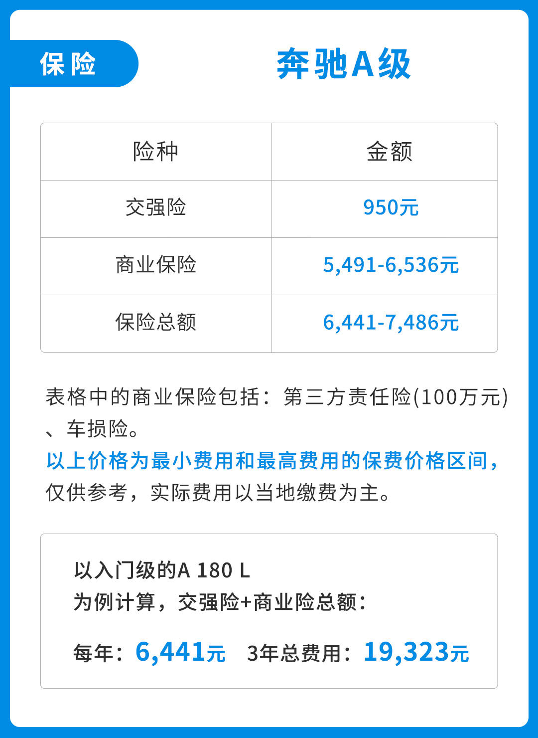 以入门版的A 180 L入门版为例,一年的保险费用为6,441元。
