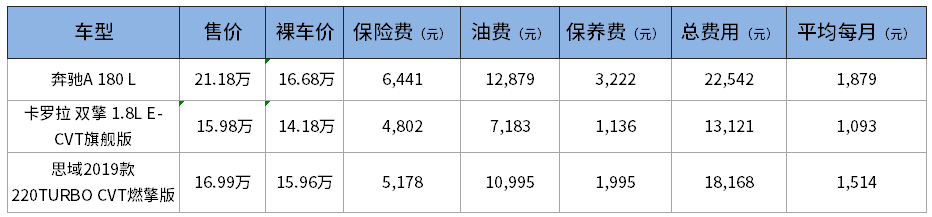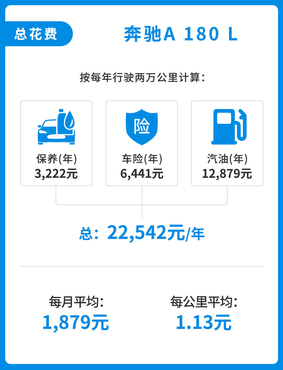 综合来看,“奔驰A 180 L”每年的固定养车成本为3,222(保养)+6,441(车险)+12,879(油费)=22,542元。每月平均约1,879元,每公里约1.13元。