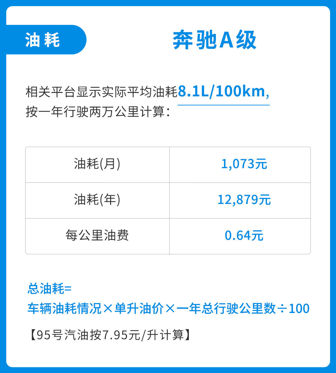 以目前广东地区95号汽油7.95元/升的价格计算,一年行驶2万公里,奔驰A级的油费为12,879元,每月平均约1,073元,每公里平均约0.64元。每年光在油费上,就比思域、卡罗拉多花2,600元左右。