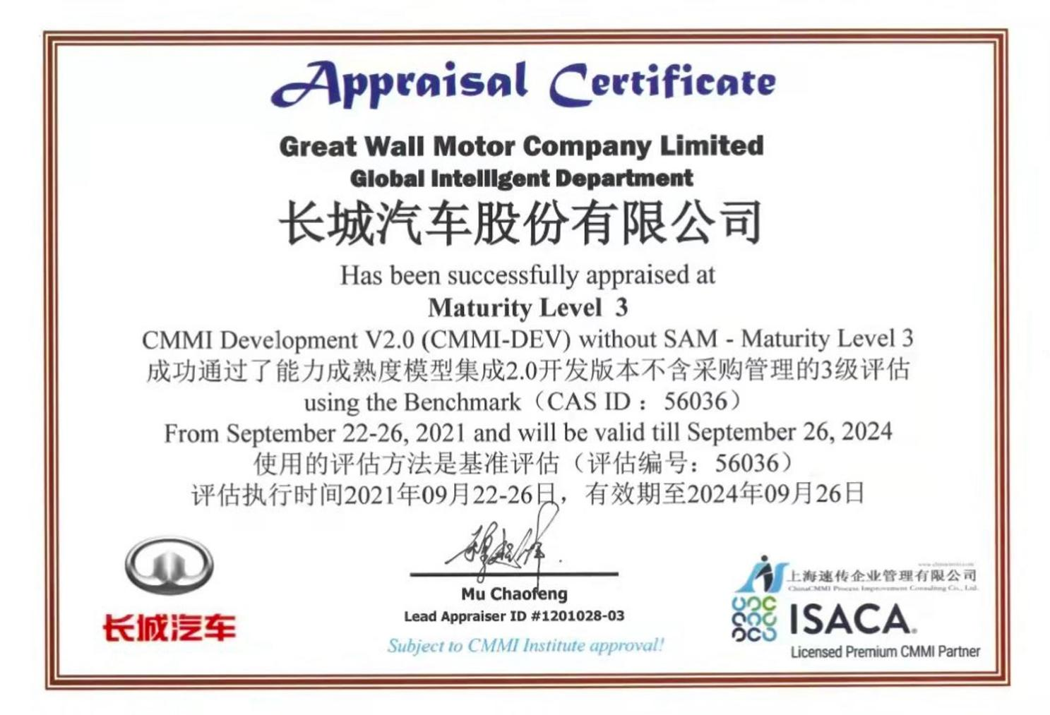 同时,长城汽车在智能座舱、安全开发和管理,以及软件开发能力及过程改进能力等方面得到了业界高度认可。9月17日,长城汽车咖啡智能在第十三届高工智能汽车开发者大会上荣获“2021上半年度智能座舱系统奖”;9月22日,长城汽车获得由国际独立第三方检测、检验和认证机构德国莱茵TÜV颁发的ISO 26262功能安全管理ASIL D等级认证证书;还通过CMMI 3级(能力成熟度模型集成)评估认证,并获得国际信息系统审计协会(ISACA)颁发的CMMI 3级认证证书。