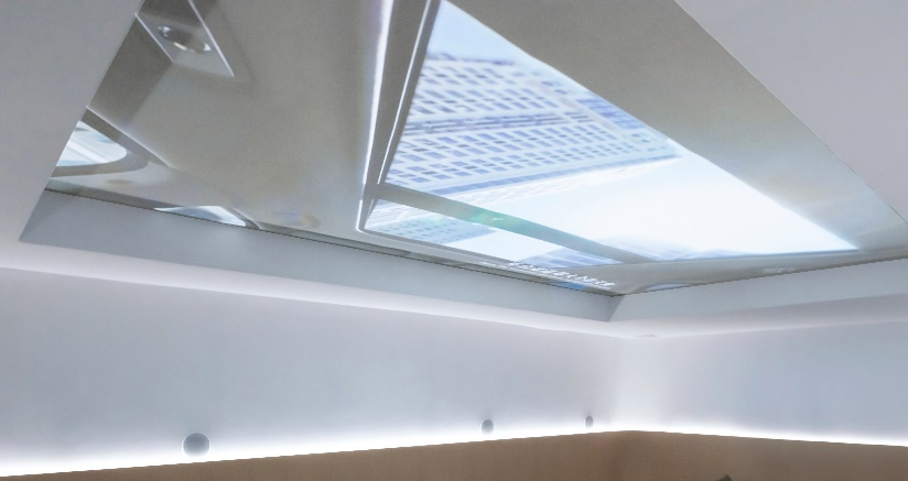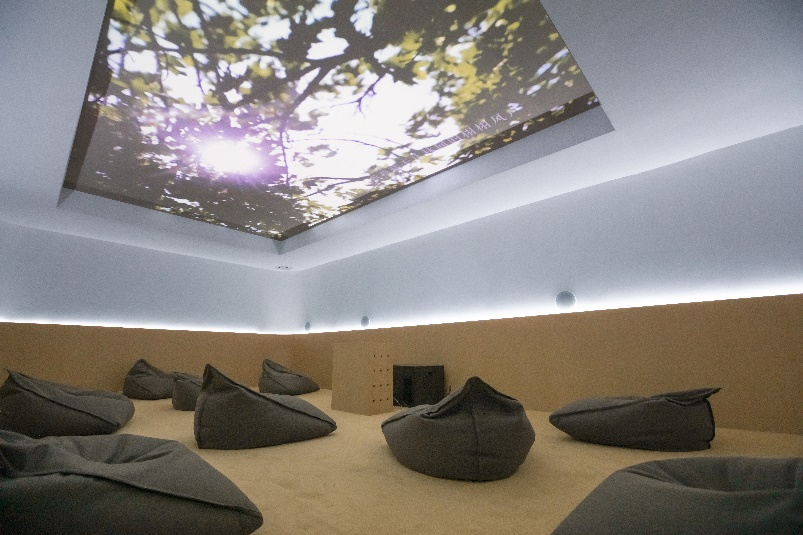 步入第三空间,光线瞬间变暗,只有上方大尺寸天窗和外界相连。半躺在舒适的超大沙发上,打开感官通道,主动去感受周围的一切。