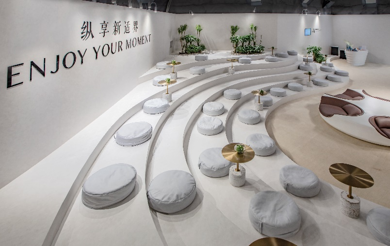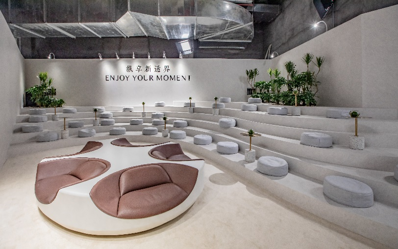 第二空间打破了常规的座椅布局,室内坐垫沿曲线布局随性摆放,体验者可以坐在自己喜欢的位置,感受巧妙的布局带来的新鲜感。以冠道(AVANCIER)大五座为模型打造的座椅摆放在正中央,座椅以高级头层牛皮为皮革原料,还搭配了高标准环保新型材料QUOLE,让人感受到奢华和舒适质感的同时,又环保健康。这样随性又舒适的排列设计,将自由想象融进每一寸空间,就像冠道(AVANCIER)的大五座空间给予体验者更宽阔的视野和不同的社会视角一样,体验者可以在追求内心感受的同时,和不同的人、事、物产生联系,在社会中处事更加得心应手。