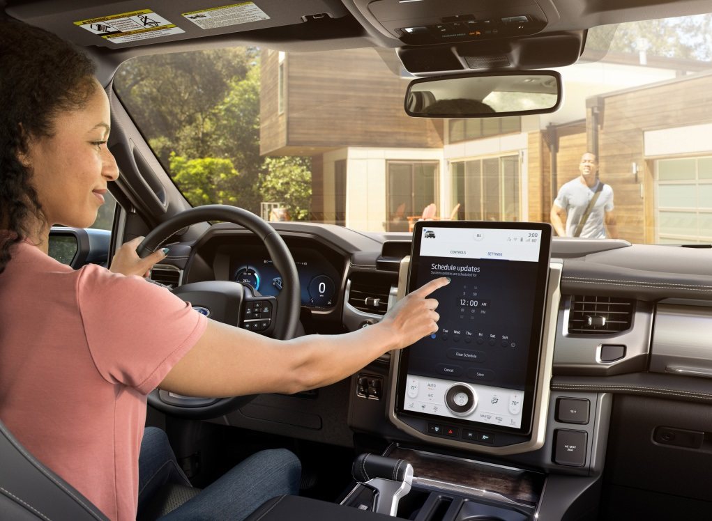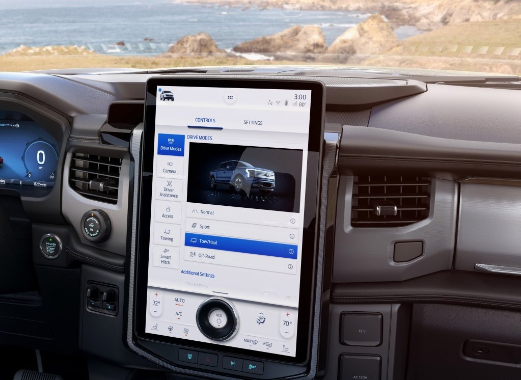 内饰部分,福特F-150 Lightning也进行了很大调整,其中最受瞩目的是中央这块15.5英寸竖置中控娱乐屏,内置看了福特SYNC 4A系统,可支持CarPlay/Android Auto手机互联,以及语音控制、导航和蓝牙等功能,在智能化方面提升显著。此外,新车还配备了12英寸的全液晶仪表盘,也算是当今豪华的标配