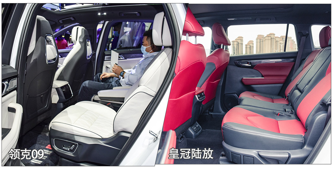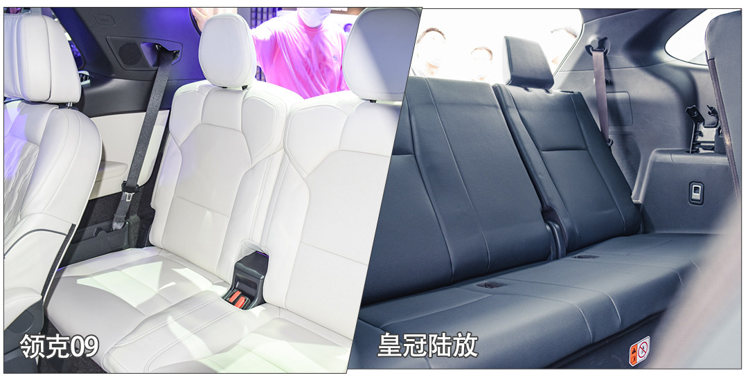 所以尽管皇冠陆放的体型比09小,实际在车内的腿部空间反而会大一些,例如通过把第二和第三排的座椅做薄来腾出位置,但坐上去体验就会一般了,不如09正经厚度的座椅来得舒服。