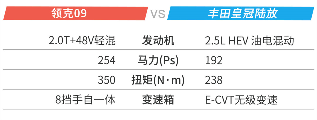 可以得出结论,两台车出于设计理念差异,在外观、内饰、空间部分各有取舍,配置一直是国产车的强项,最后的机械规格,09凭借架构优势力压皇冠陆放,只是油耗不低还吃95号,但在中大型SUV中属于正常水平。