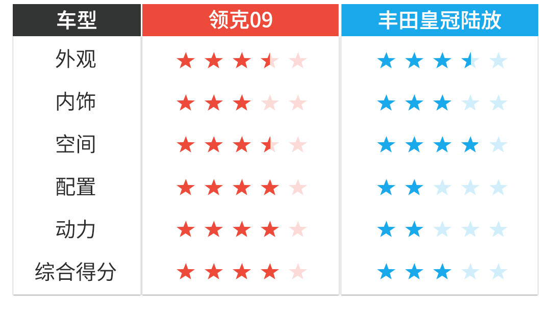 本来是一篇双车对比,结果到最后发现差距有些明显,虽然拿定位更高的领克09来对比丰田皇冠陆放有些不公,但毕竟价格相当。其实买09和皇冠陆放完全是两拨人,前者适合看重品牌带来的附加值,后者则是用来满足家庭刚需,两款产品调性鲜明,其实不用纠结太久,相信在看完文章后你已经有了明确的答案。
