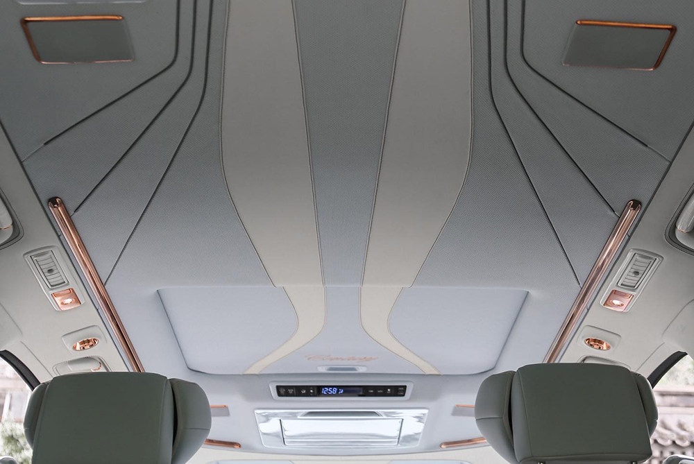 除此之外,就连车顶也都没有放过,虽然它并没有采用类似于劳斯莱斯的那种星空顶设计,但也都采用了蓝白拼接的皮质所覆盖。细节之处,例如空调出风口边缘同样也采用了玫瑰金配色的饰条所点缀,进一步提升车内的豪华氛围。