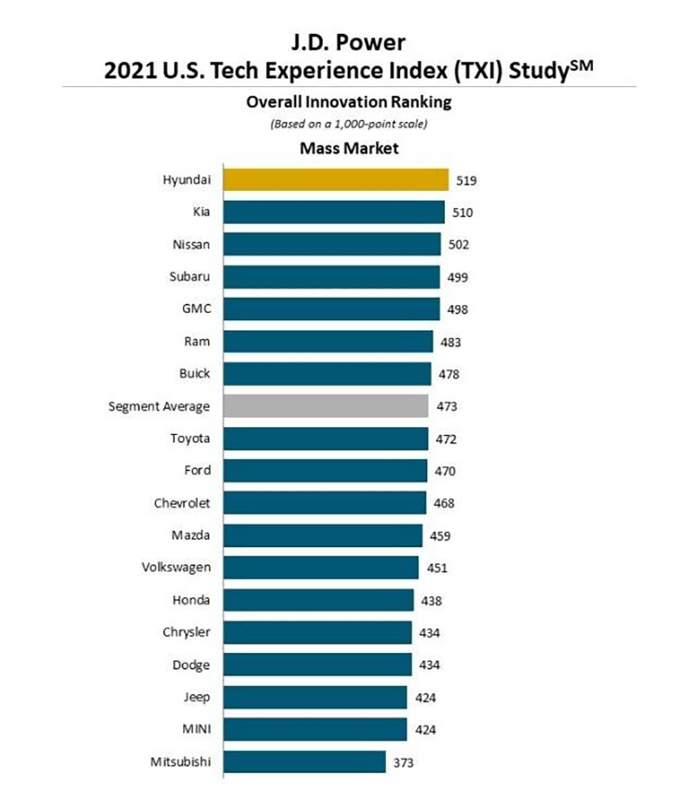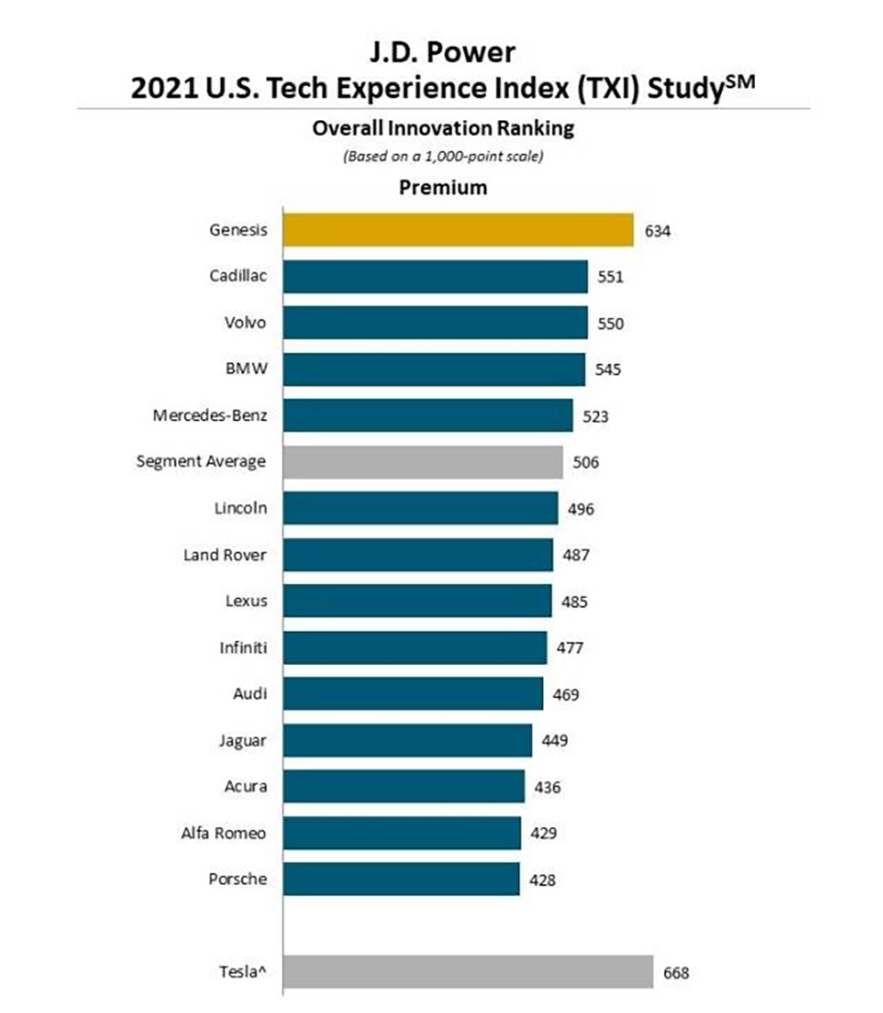 而在近日,国际权威调查机构 J.D.Power 公布了2021年美国新车科技体验指数调查报告,现代汽车和捷尼赛思分别拿下2021年普通汽车品牌和豪华汽车品牌创新科技最高分,是不是觉得特别意外?当买买君看到时也觉得不可思议,现代汽车和其高端品牌捷尼赛思同时拿下最高分,难免让人怀疑这是充值了?