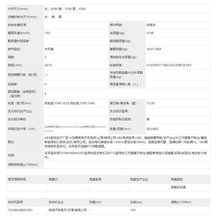 动力方面,新车预计将搭载由纬湃汽车电子(天津)有限公司所生产的驱动电机,型号分别为TZ190HSBMCF61和TZ190HSAMCF61,其最大功率分别为182马力和204马力。电池方面,配备的是三元锂电池组,不过现在尚未公布它的续航里程。