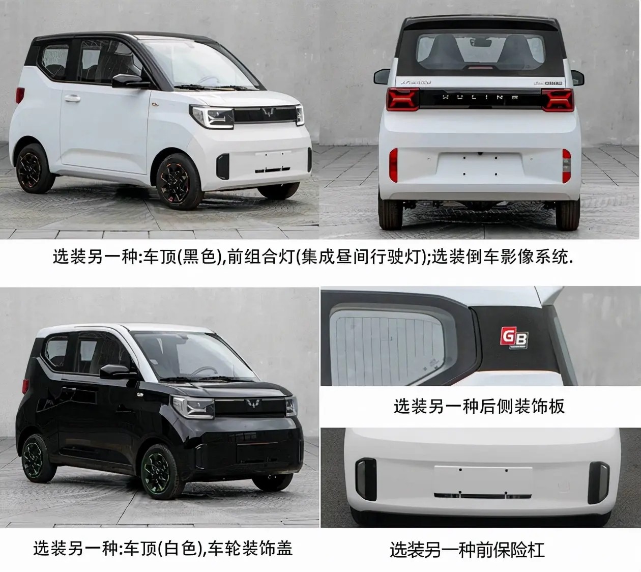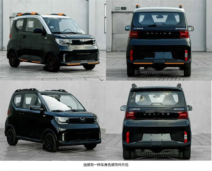 从申报图中可以看到,银标五菱宏光MINIEV跨界版车型整个车身加装了大量装饰板,例如前包围、侧裙、车顶行李架以及尾部底部等位置都加入撞色装饰板,并且五菱汽车提供有黑色、绿色、橙色的装饰板可选,消费者可以根据自己的喜好来搭配。