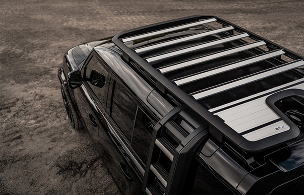 在车身侧面可以看到,路虎卫士改装版选用Valiance Tuxedo Black车漆涂料,专属的黑色漆面在太阳光照耀下拥有一番风味,该车气场丝毫不输奔驰G级。