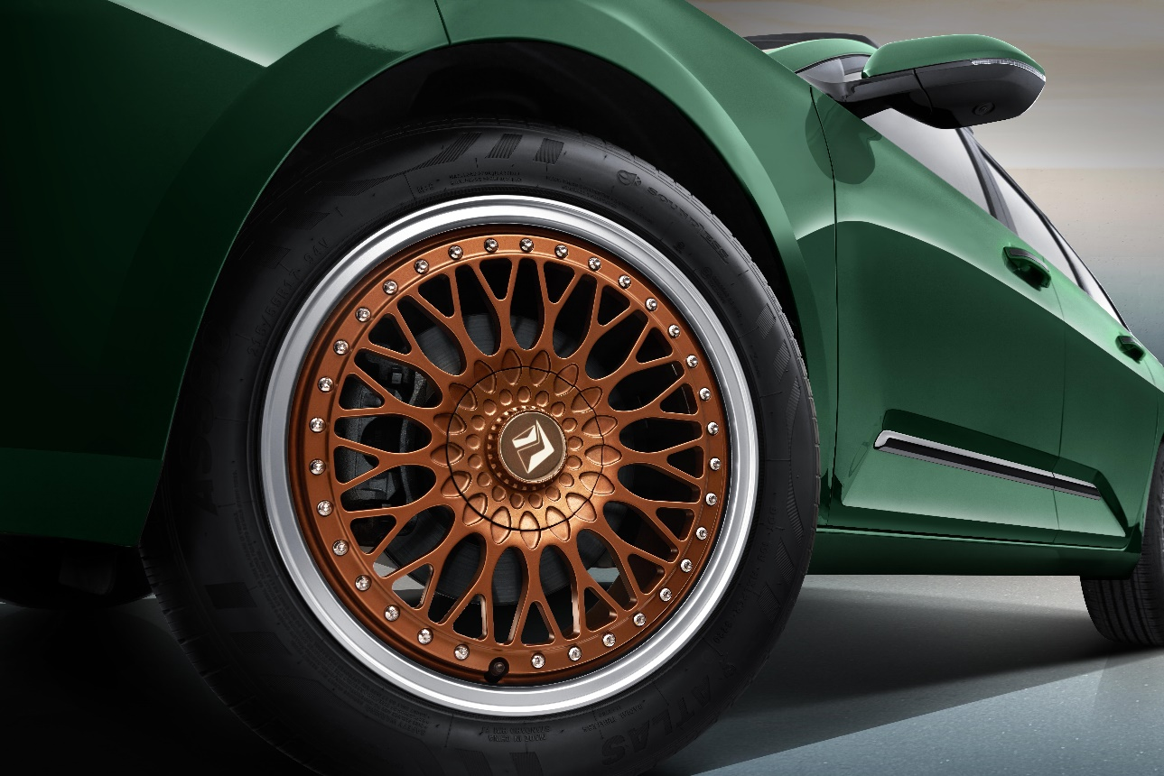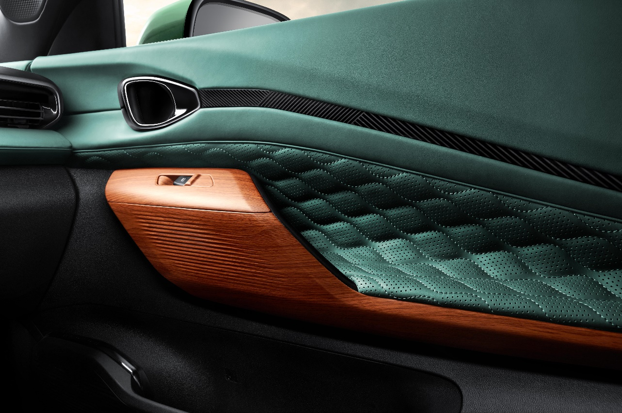 内饰细节上,新车采用少有的原创立体式打孔波浪纹座椅版型,缝线精密,精选皮料包覆,带来丰富的触感与视觉高级感。哑光木纹扶手搭配沉稳的绿色内饰,尽显复古绅士风范。在新车的可调色流星星空顶之下,还布满星星点点的LED氛围灯,可64色随心切换,满载生活仪式感。另外,新车搭配双片式交叉条辐轮毂,采用黄铜、白银双色设计,加上复古有型的轻量化旋压铸造工艺,令车辆动静皆优雅。