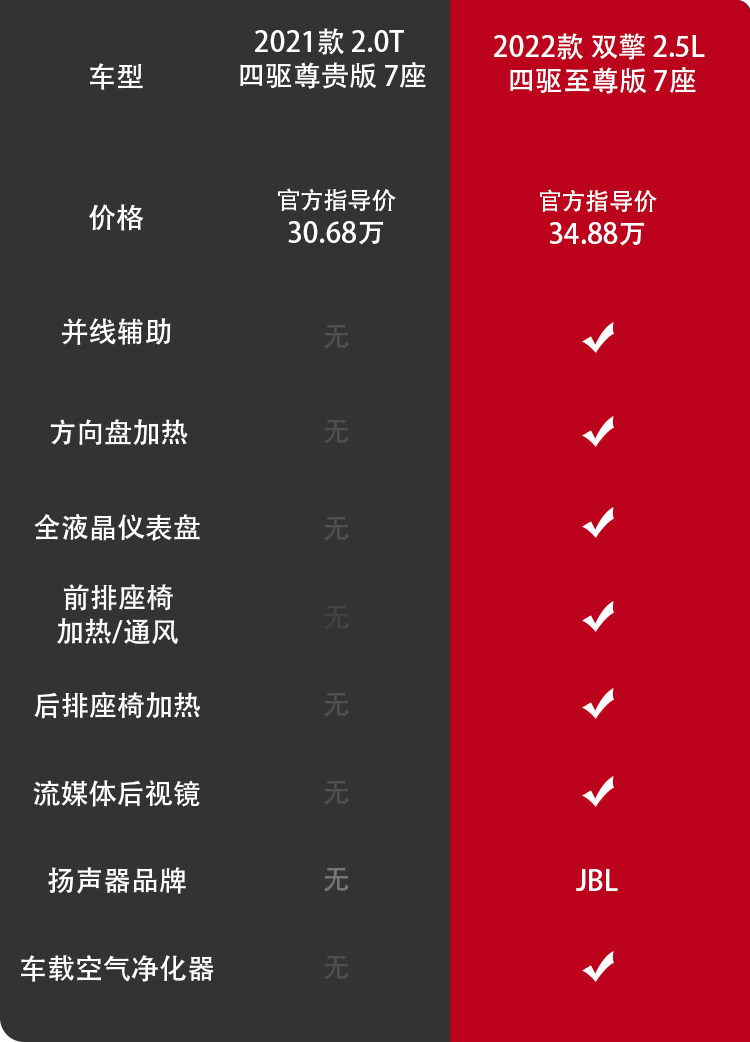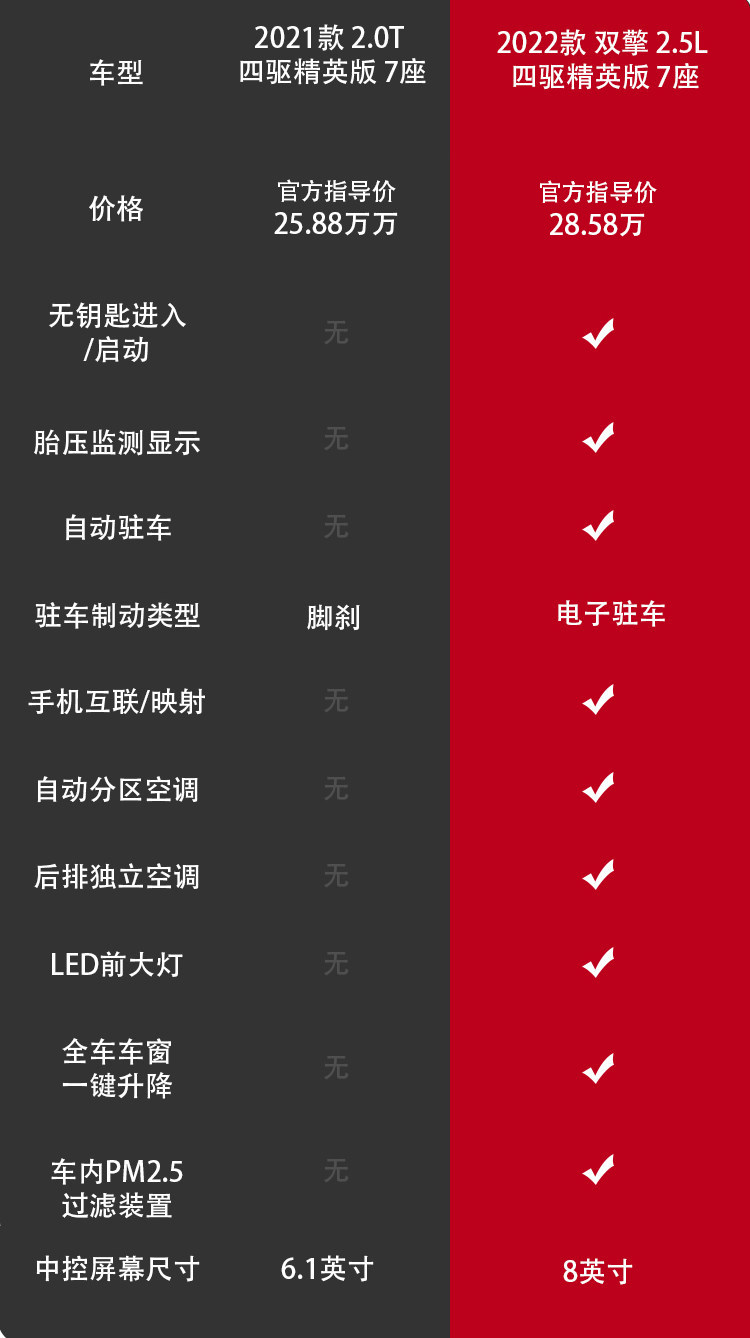 2022款 双擎 2.5L 四驱精英版 7座(28.58万)和2021款 2.0T 四驱精英版 7座(25.88万)两者均为相同版本,除了使用的动力系统不同以外,具体差异性的地方主要体现在实用性以及舒适性功能上。