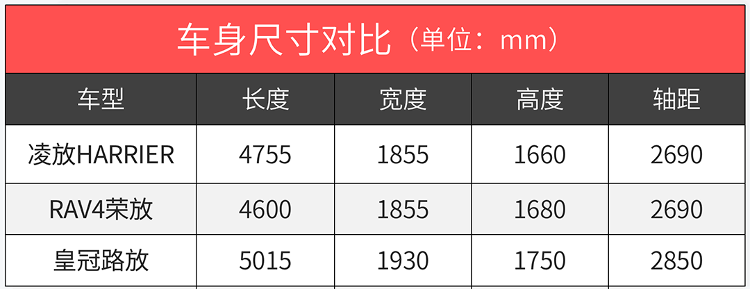 一汽丰田凌放虽然跟荣放采用了相同平台,但外观和内饰确实变化很大,从尺寸上来看,车长加长了155mm,车高降低了20mm,其余尺寸跟荣放保持一致,所以从整车视觉上凌放的车身比例会更修长。