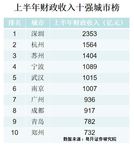 近日,粤开证券研究院公布一份最新国内城市上半年财政收入10强榜单,榜单中除去北京、上海、天津、重庆等四大直辖市,深圳上半年以2353亿元收入稳居首位,而杭州、苏州、宁波、武汉、南京也分别以千亿级财政收入分别位列二至六名。