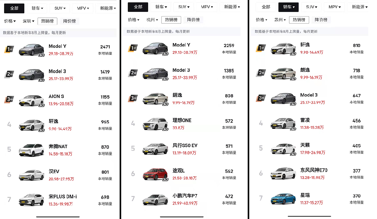 抛开新能源领域车型,以经济、家用属性定位的轩逸和朗逸是深圳、杭州、苏州等三地卖得最好的燃油车型。