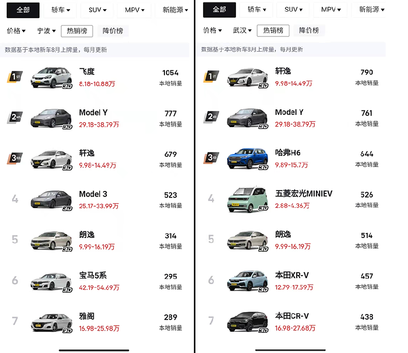 武汉卖得最好的燃油车是轩逸和哈弗H6,两款车型都各自是细分领域的佼佼者,成为武汉当地8月销量最高的车型也不足为奇。值得一提的是,武汉作为法系车“大本营”,其当地法系车销量却不见有较亮眼的表现,即使是当前法系品牌较为叫座的标致408,也仅仅在当地卖出179辆,实属有点可惜。