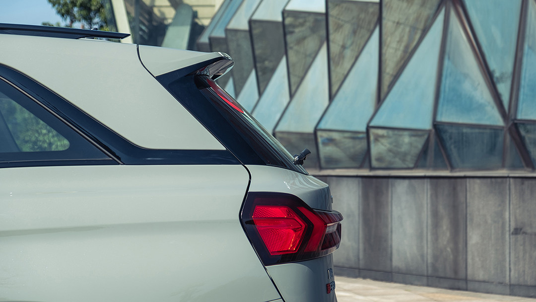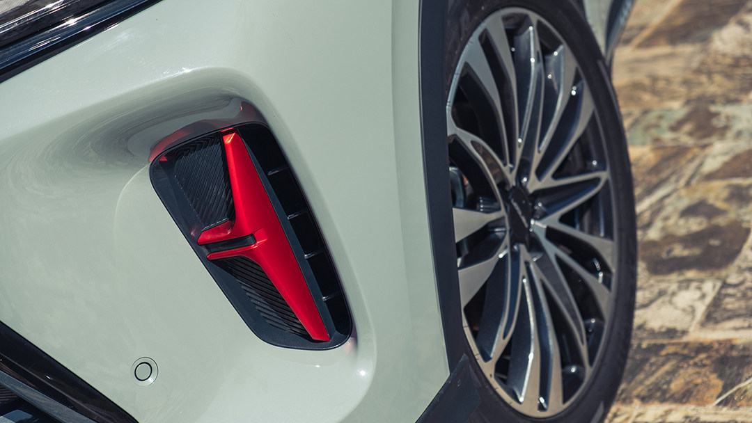硕大的黑色中网占据了前脸的大部分面积,前大灯通过黑色的饰条与中网融为一体,让前脸造型看起来更有整体感,将两个大灯相连的镀铬饰条以及前包围两侧进气口的红色装饰件则为前脸增添了一些细节,让前脸看起来不至于太过单调。