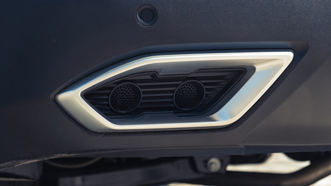 而后包围下方也加入了一些造型有点像扩散器的浮雕设计,并且有两个模仿排气孔的银色装饰。