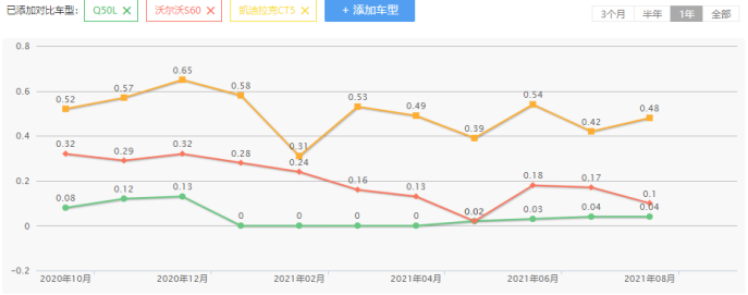 不过,将近8个年头的英菲尼迪Q50L在销量上还是没能挺住,今年以来月销基本维持在三四百台的状态,与沃尔沃S60、凯迪拉克CT5都有一定差距,更不用和BBA的“34C”比了。