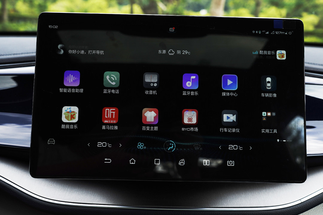走进车内,一股熟悉的比亚迪感觉扑面而来,首先是那个可旋转的大尺寸中控屏,整体的用料、配色已经挑不出什么毛病,其智能网联并支持诸多第三方软件的系统已经是比亚迪车型的重要卖点之一,也是秦PLUS DM-i家族传承元素之一,中文的按键标识也是比亚迪重要的标志。