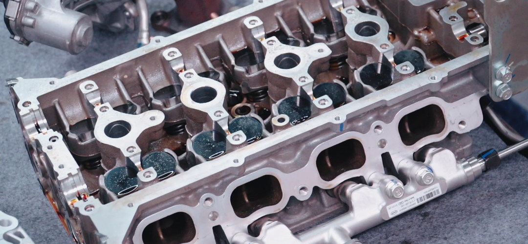 由于这台发动机采用直喷系统,所以在气门以及进气道方面会容易产生积碳。根据实际情况来看,只有活塞表面以及气缸顶部有一层非常薄的积碳痕迹,其他地方都不严重,对于一副2万公里的发动机来说是非常正常的,对于日常道路行没有任何影响。