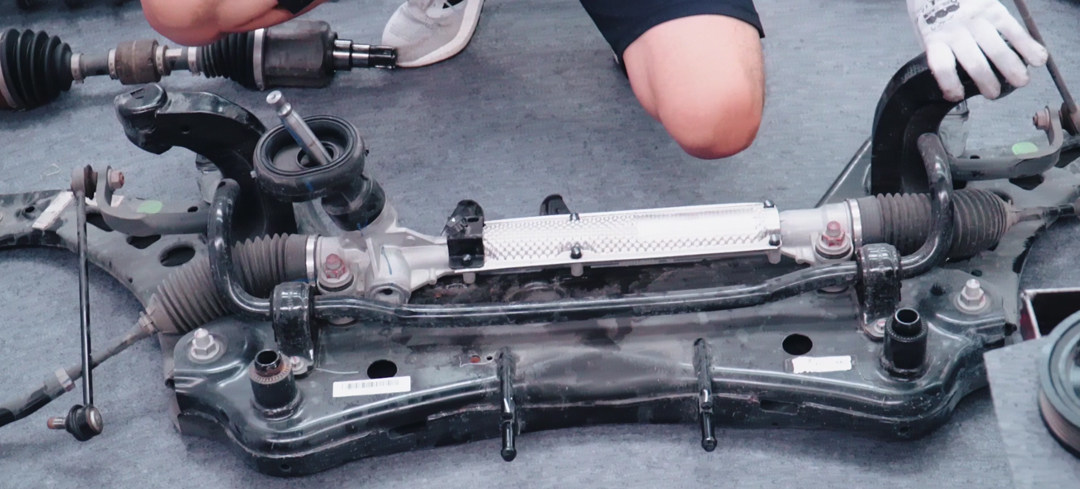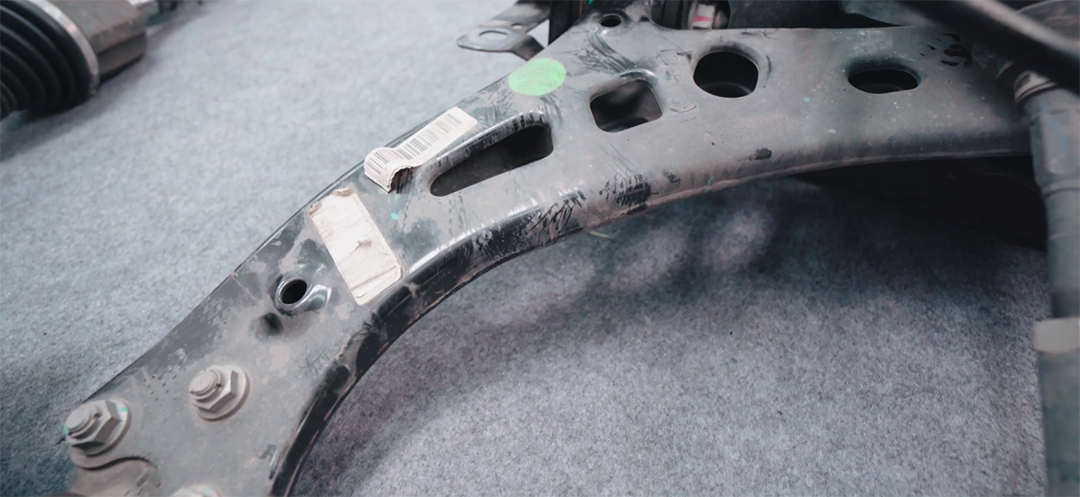 另外在拆解底盘时,东风风行T5 EVO有一个非常有意思的结构,它通过一个钢制的部件让副车架与车架形成闭环连接,形成全框式副车架的作用,一方面能增强车头刚性,提升车头响应性,另一方面能在遇到碰撞时将副车架下沉,保护驾乘人员的安全。
