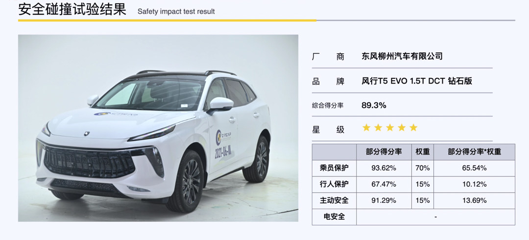 东风风行T5 EVO在C-NCAP测试中获得了最高级别的五星评价,说明了东风风行T5 EVO在安全性能方面的优秀。