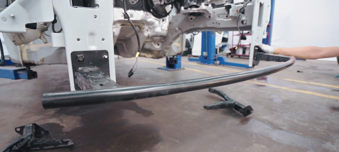 除此以外,拆解过后能从其车架上发现一些亮点。首先是防撞钢梁,东风风行T5 EVO的防撞钢梁使用铝合金材质,同时使用“目”字型结构加强,能有效防护车辆前部冲击,同时吸能盒也同样使用铝合金材质,并且使用螺丝固定,在遇到轻微碰撞时能通过拆卸螺丝更换防撞钢梁。