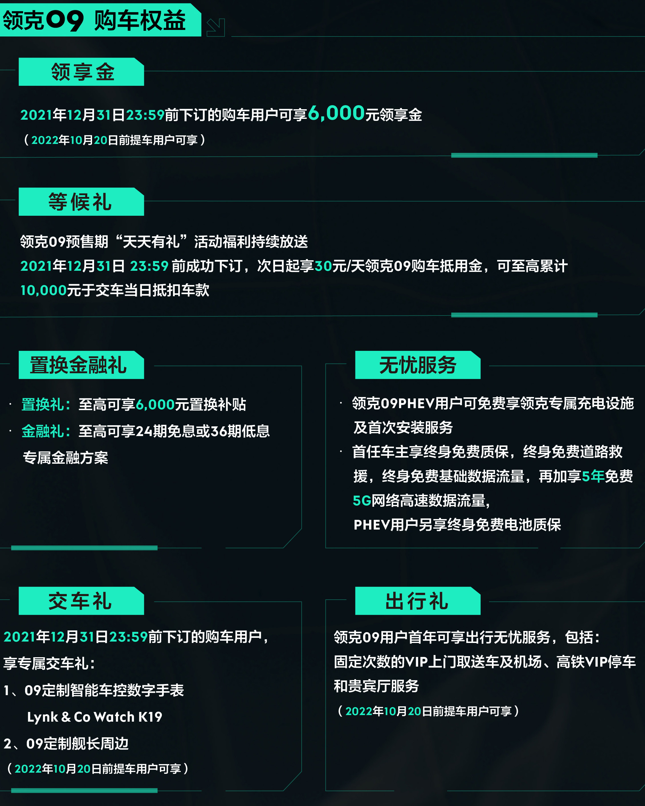 相关购车权益中,比如有领会享金,2021年12月31日23:59前下定的购车用户可享6000元领享金(可抵扣车款,但需2022年10月20日提车用户可享);等候礼,2021年12月31日23:59前成功下订,次日可享30元/天领克09购车抵用金,最高可累计10000元,这也是缓解由于芯片紧缺所产生的产能问题。另外还有置换金融礼、无忧服务礼、交车礼、出行礼等等一系列购车权益。